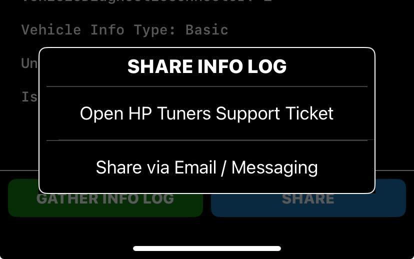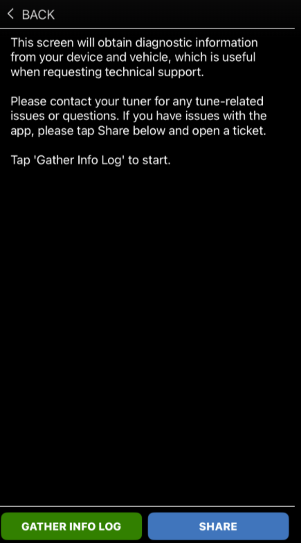When the app has finished gathering the Info Log, tap SHARE to email the log to customer support.