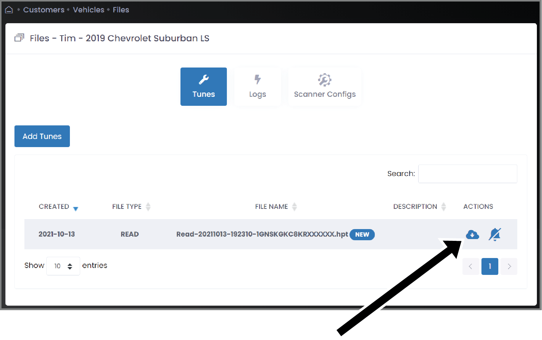 icon next to the customer whose files you wish to retrieve. The customer’s vehicle page appears.NOTE: If your web browser window is not very wide, you may not see the icons in the Actions column. Instead, there will be a blue plus sign on the left end of the table. Select this icon to display the remaining options.