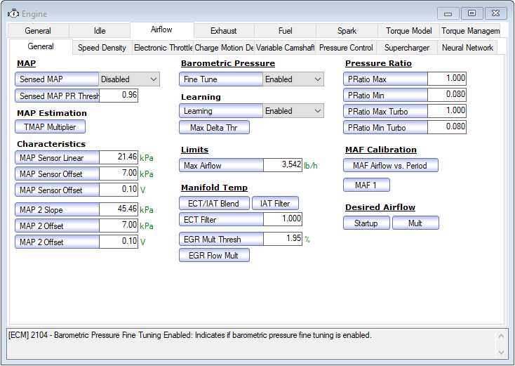 If there are enough parameters in the group, there will be one or two rows of tabs at the top of the window. The second row (if present) are subtabs of the first row. For example, the tab selected in the graphic below is a subtab of the Airflow tab in the first row.