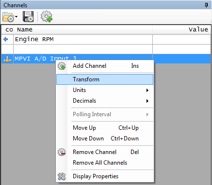 On the Channel display, you can right click a channel to bring up the menu. If the channel supports transformation, you will see an option called "Transform".