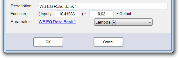 The Function fields define how the numerical values associated with the input are converted to their corresponding output values. In the sample screen above, the function is converting values in the range 0-5 (volts) to values in the range 0.62-1.10 (Lambda).