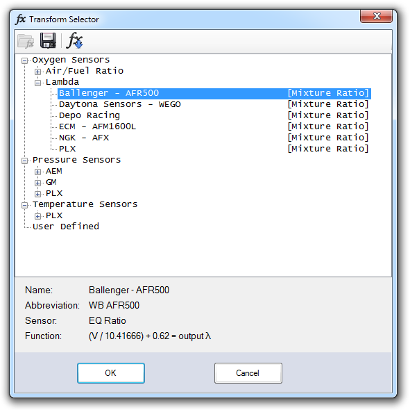 In this example, I first selected Ballenger - AFR500, then clicked the Fx to copy it down into the User Defined area. This gives me a starting point close to my input sensor. Then, you can add any offsets needed for your specific installation.